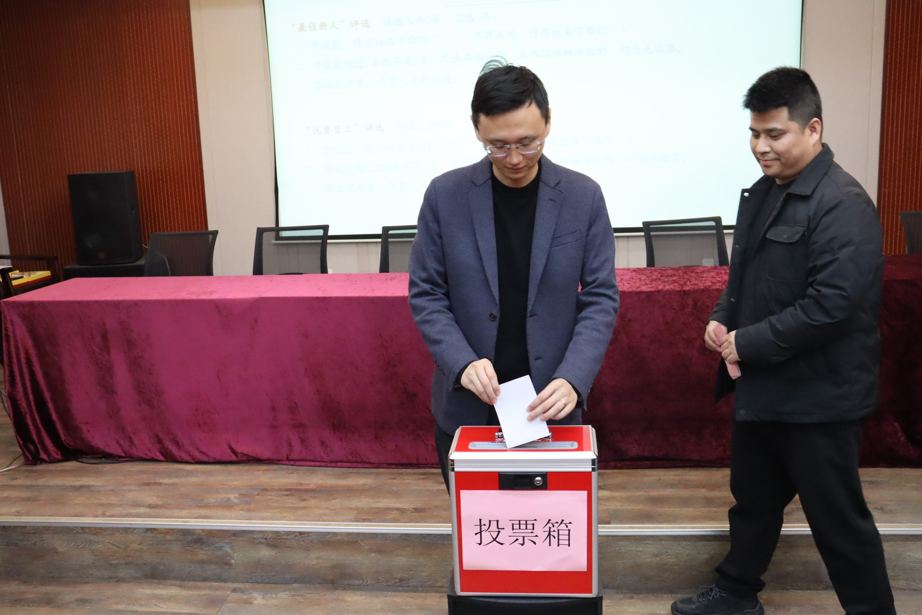 大会首先进行2025年度先进评选环节。经综合考评,共有6名优秀员工与最佳新人候选人获得提名。候选人依次上台进行述职发言,分享工作成果与心得体会。随后,现场组织全体参会人员进行公开投票与计票,最终评选出2名优秀员工和1名最佳新人。